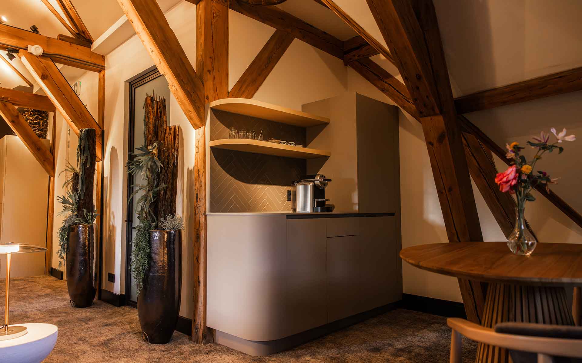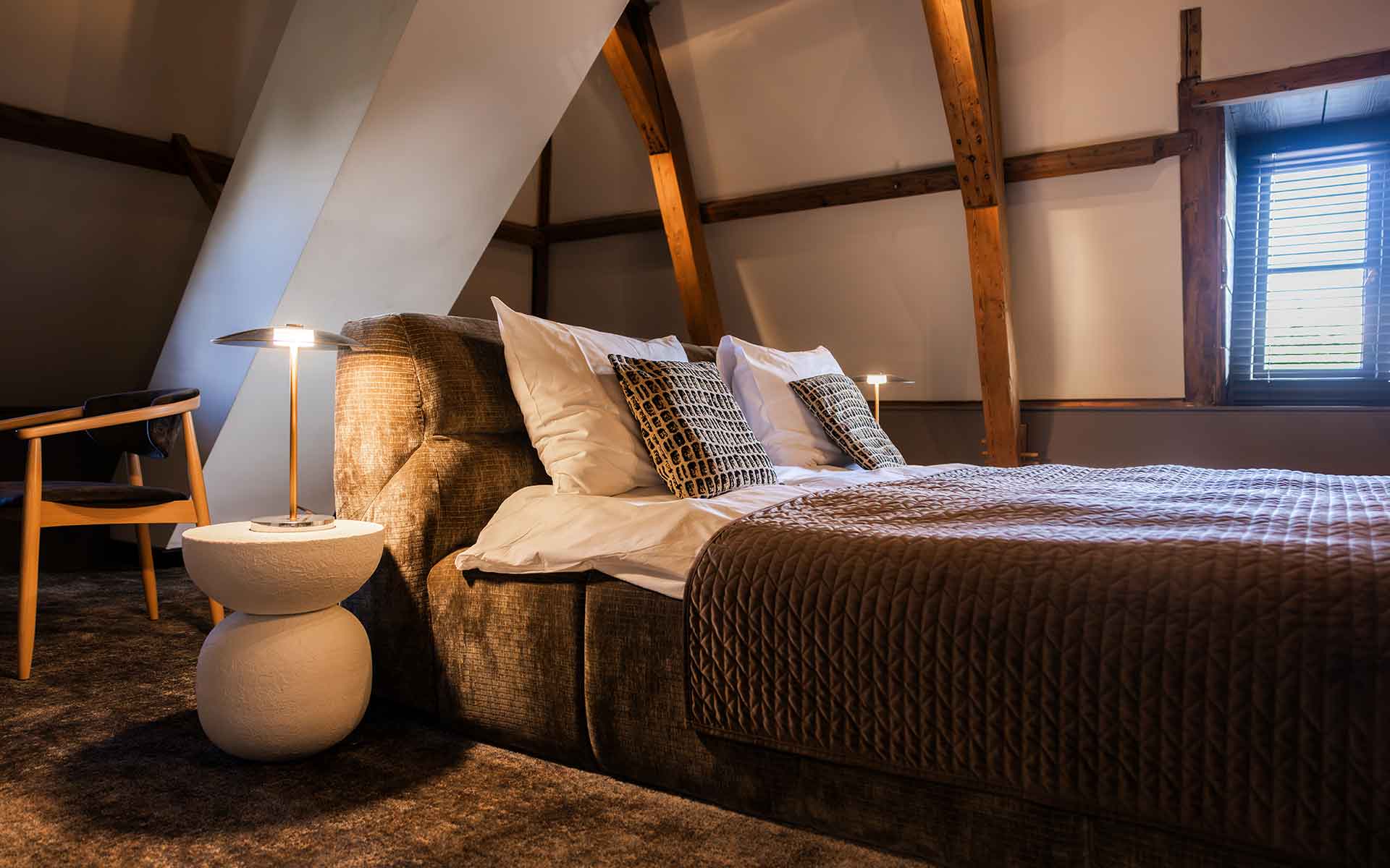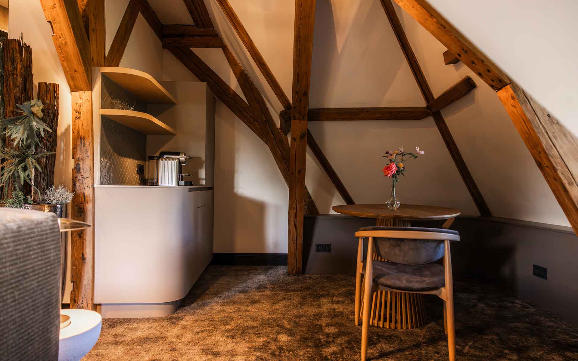 Deze bijzondere suite bevindt zich op zolder en ademt de rijke geschiedenis van het pand. De authentieke houten balken, de sfeervolle inrichting en de warme uitstraling zorgen voor een unieke ambiance waarin verleden en heden moeiteloos samenkomen. Hier verblijf je niet zomaar in een hotelkamer, maar in een ruimte met een verhaal.
